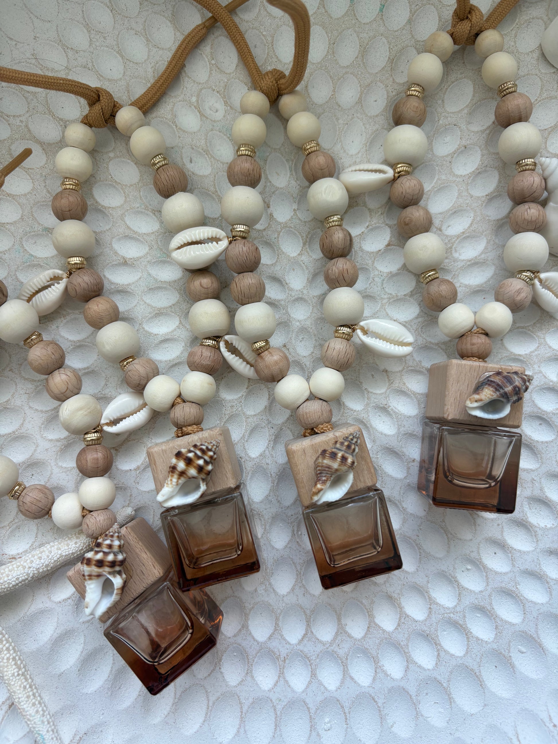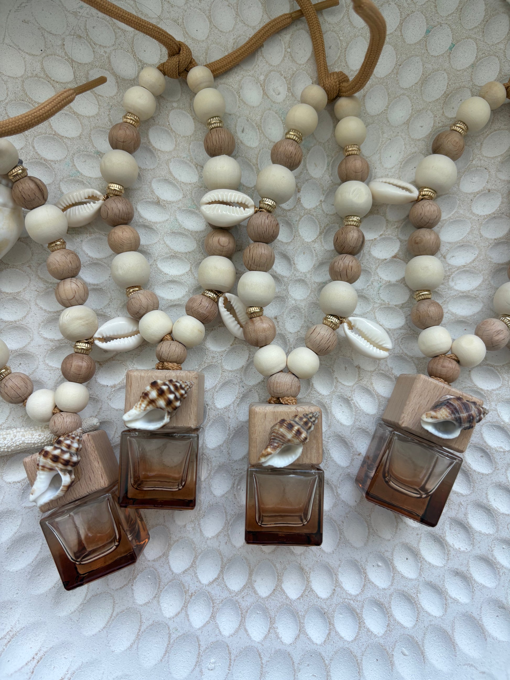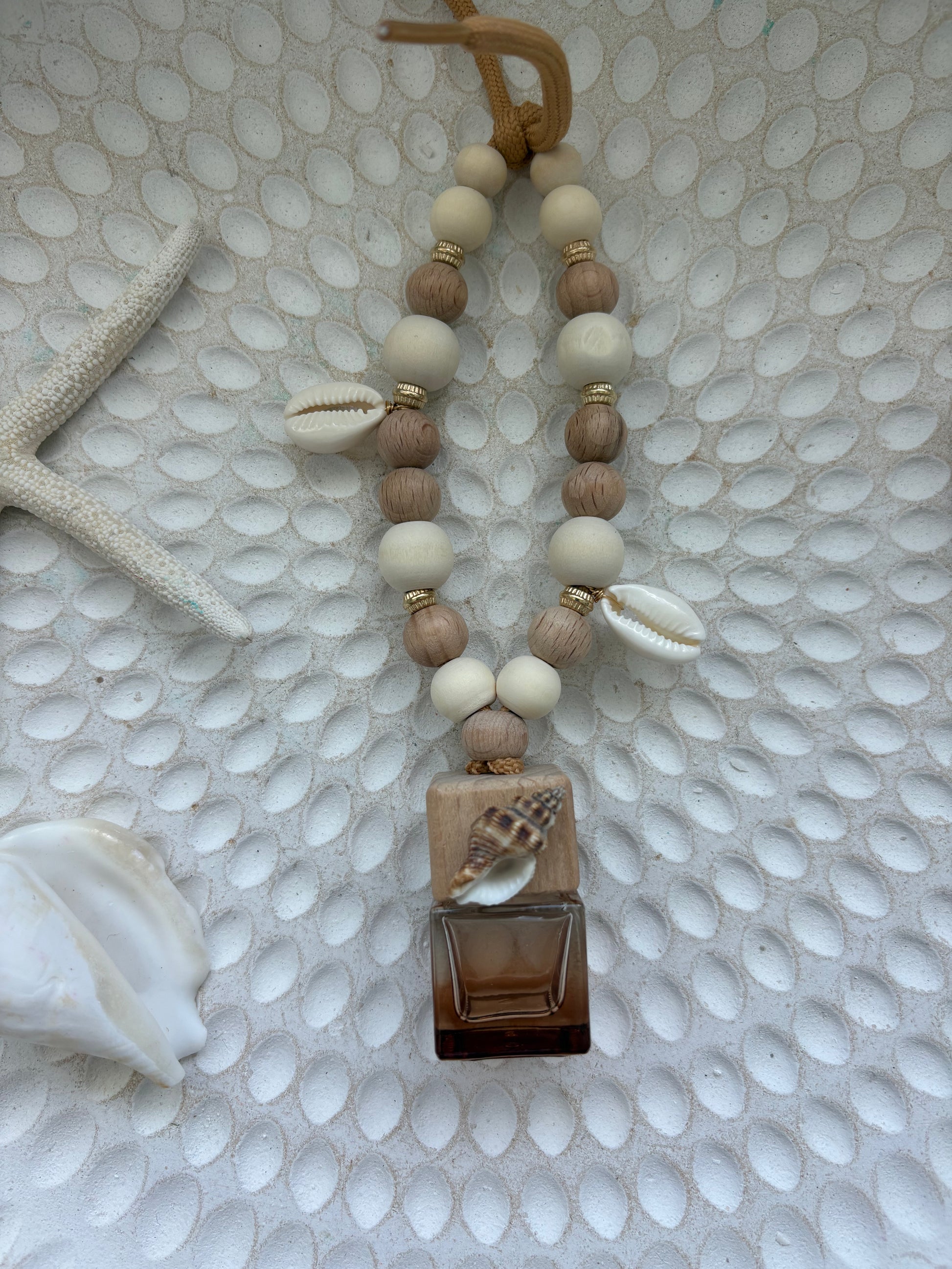 Bring effortless beachside calm to every drive with our handcrafted Amber Shell Car Diffuser. Featuring warm amber tones, natural wooden beads, and delicate shell accents, this elegant piece adds a relaxed coastal cowgirl touch to your car while filling your space with a soft, luxe aroma.