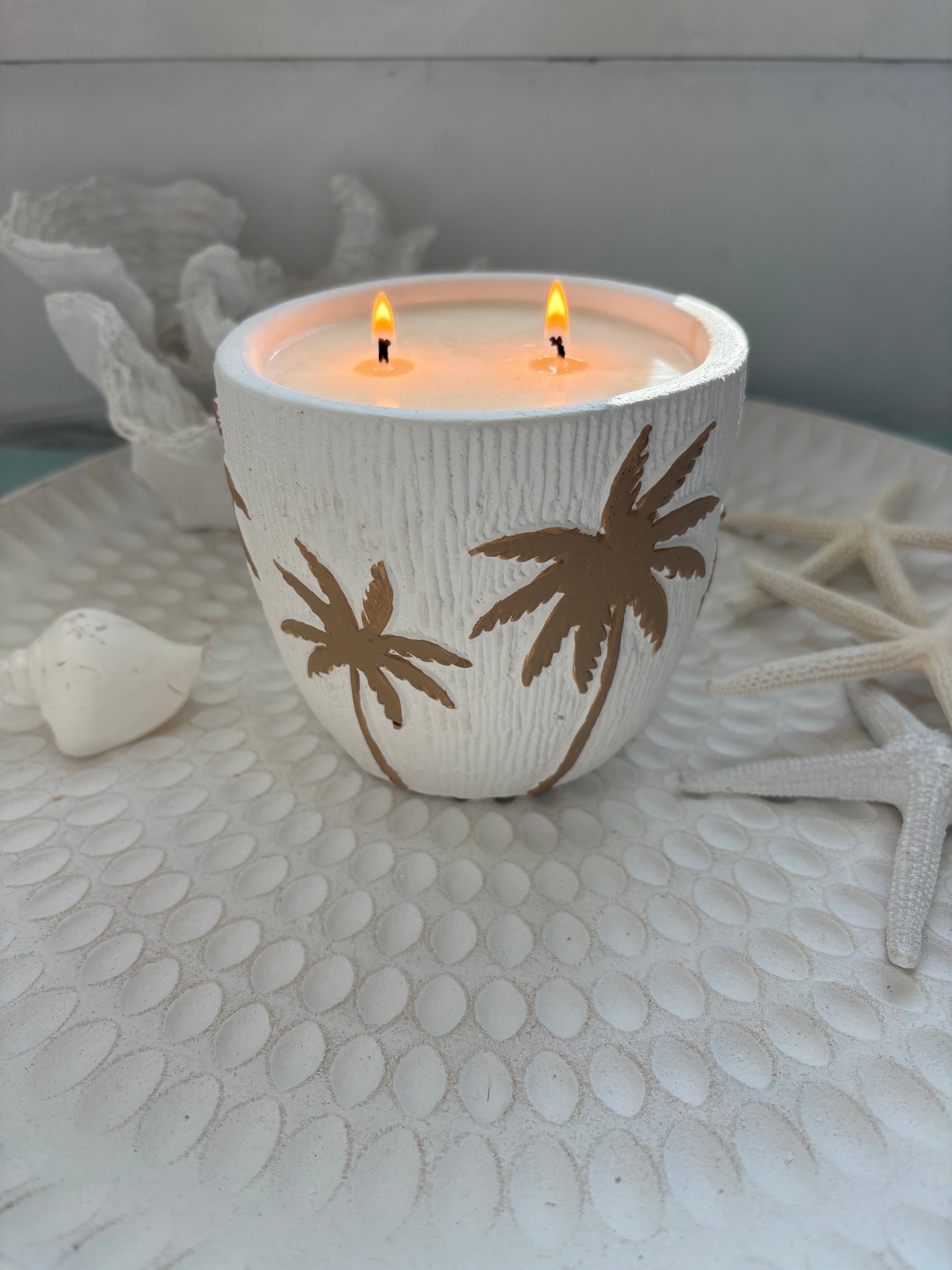 Hand-poured into a textured concrete vessel adorned with sun-kissed palm trees, this statement piece brings a true beachside feel. Crafted from pure soy wax and dual cotton wicks, it delivers a clean, even burn while filling your space with your chosen coastal-inspired fragrance.