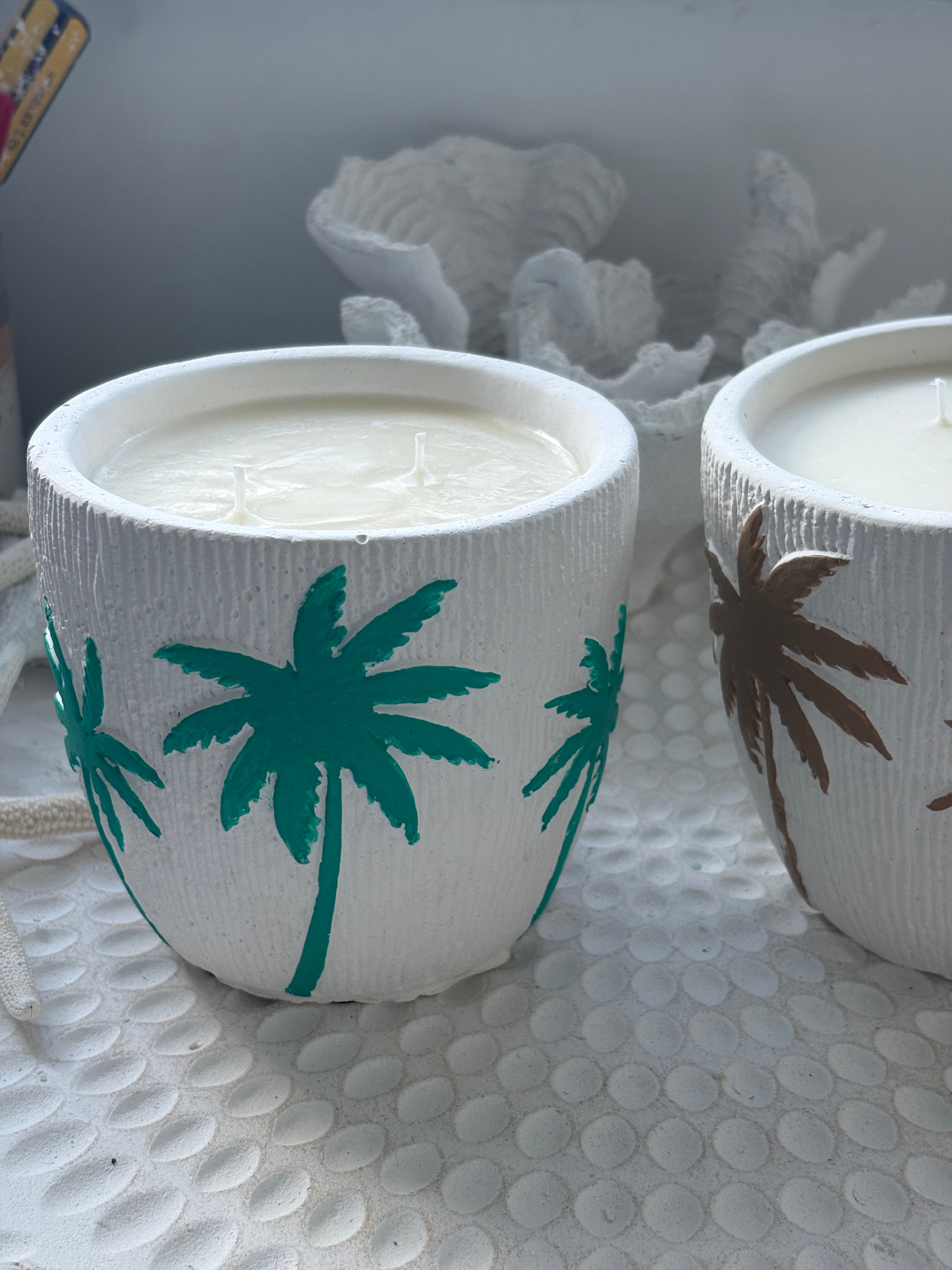 Hand-poured into a textured concrete vessel adorned with sun-kissed palm trees, this statement piece brings a true beachside feel. Crafted from pure soy wax and dual cotton wicks, it delivers a clean, even burn while filling your space with your chosen coastal-inspired fragrance.