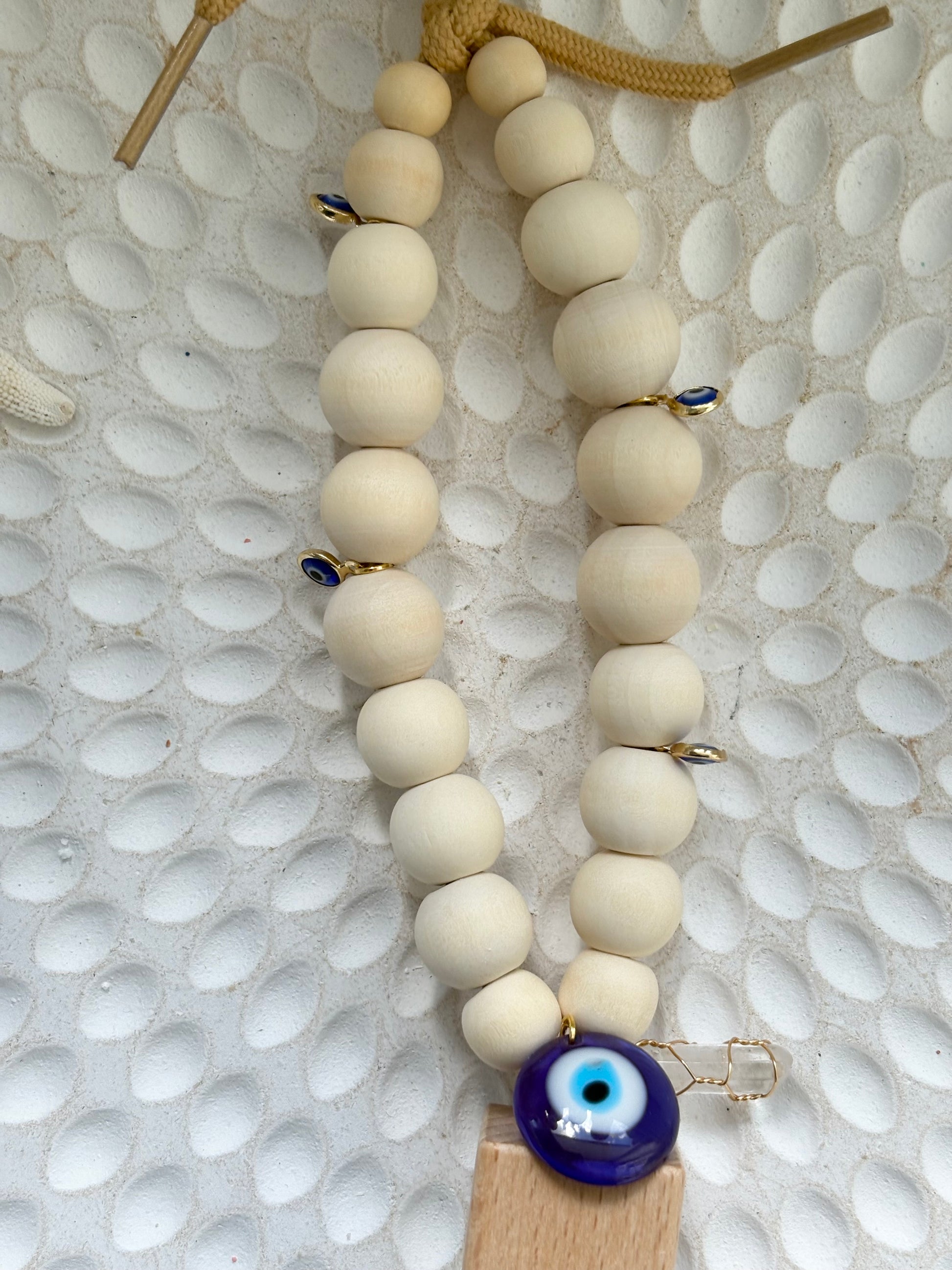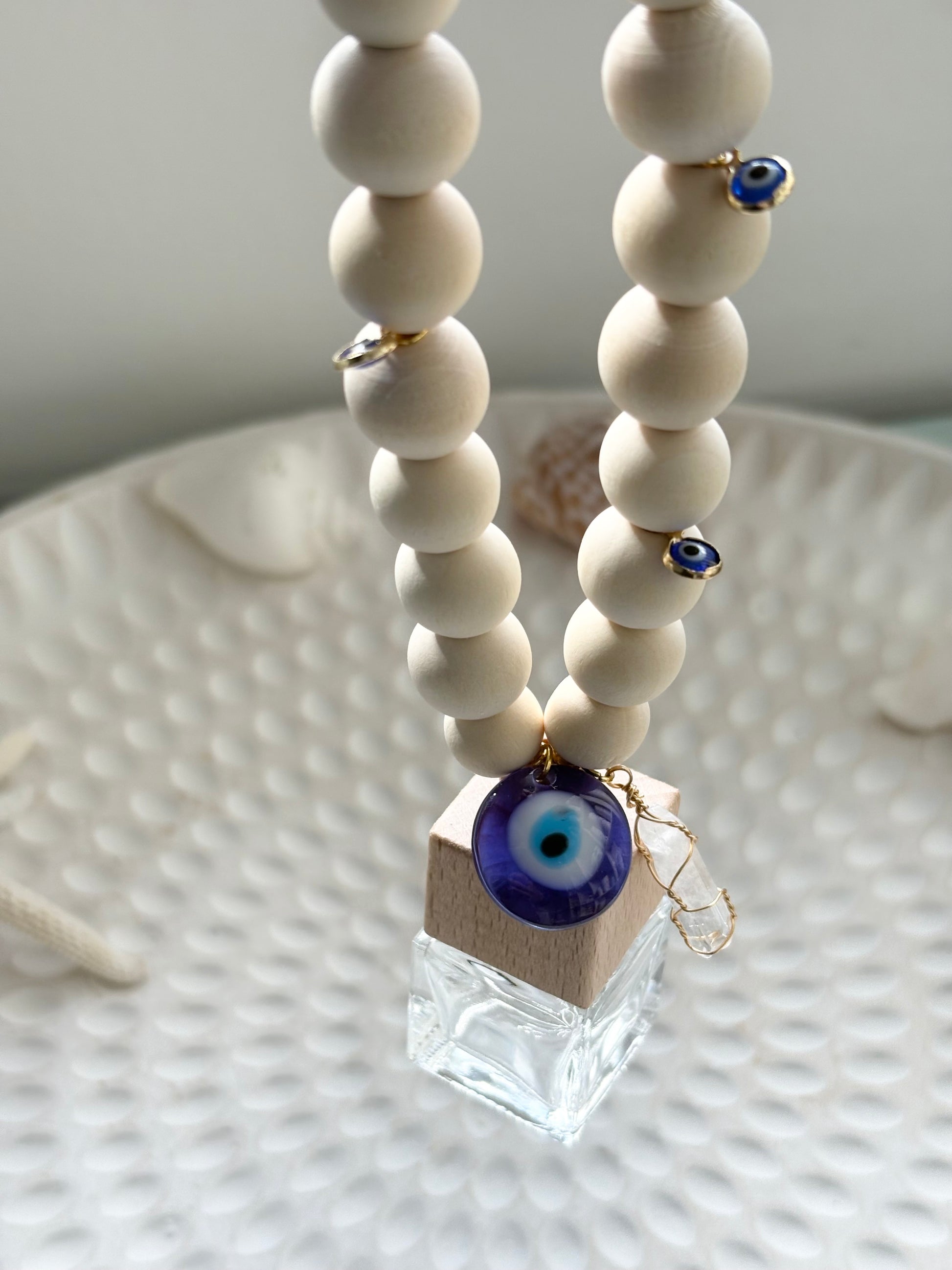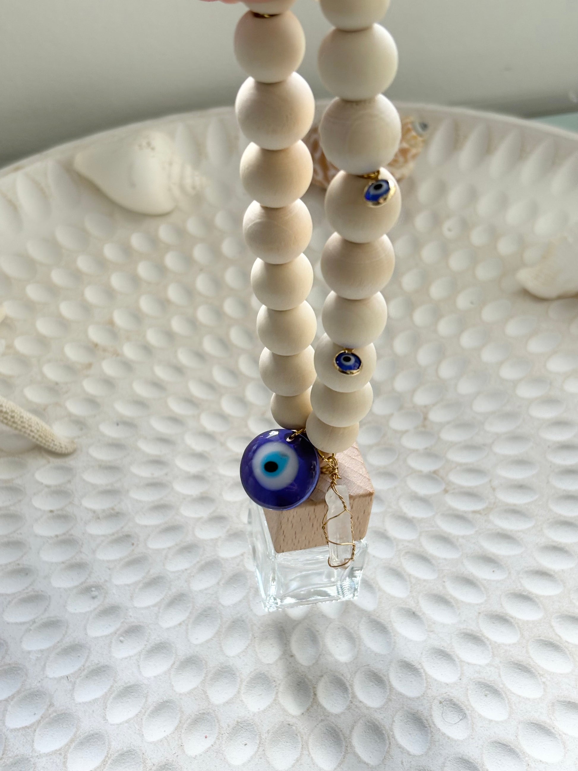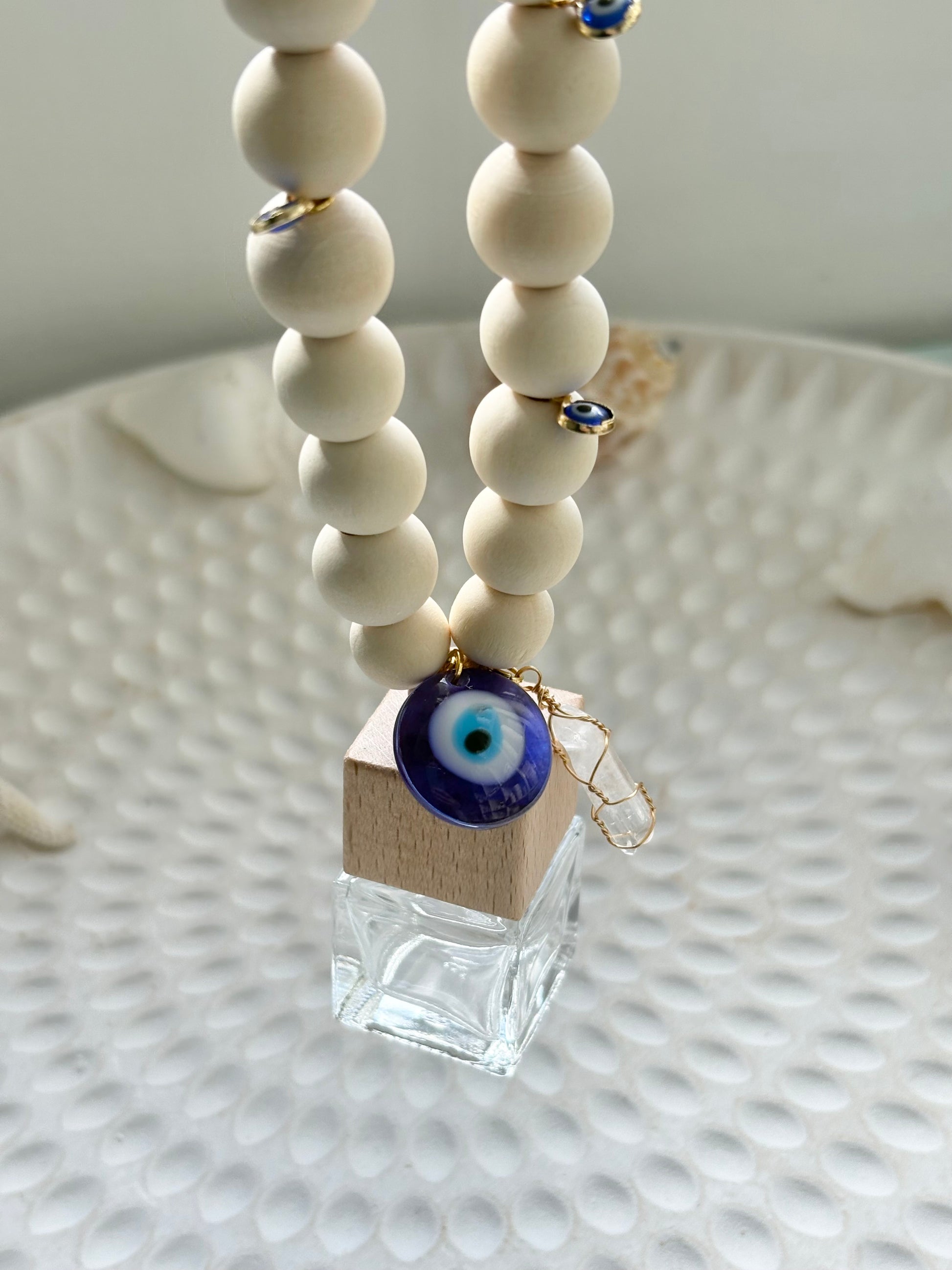 A diffuser with energy. Our Ocean Guardian Car Diffuser combines coastal calm with spiritual strength, featuring natural wood beads, a protective evil eye charm, and a raw quartz crystal to keep your space grounded and protected.
