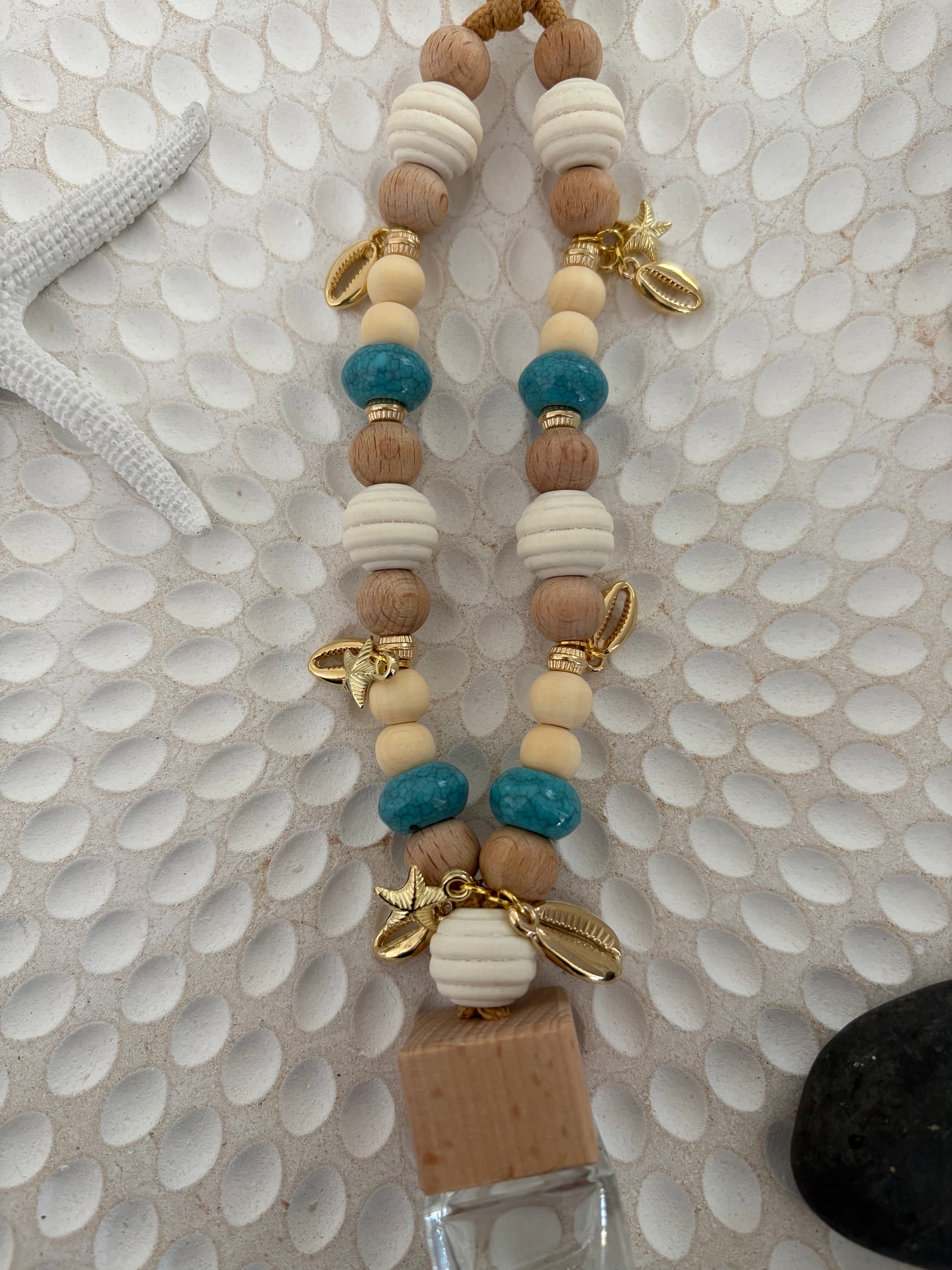 Drift into that carefree coastal state of mind with our Sea Breeze Babe car diffuser — where earthy textures meet ocean soul. Designed with raw wooden beads, soft aqua accents, and golden coastal charms, this beauty brings all the beachy boho vibes right to your rearview mirror.