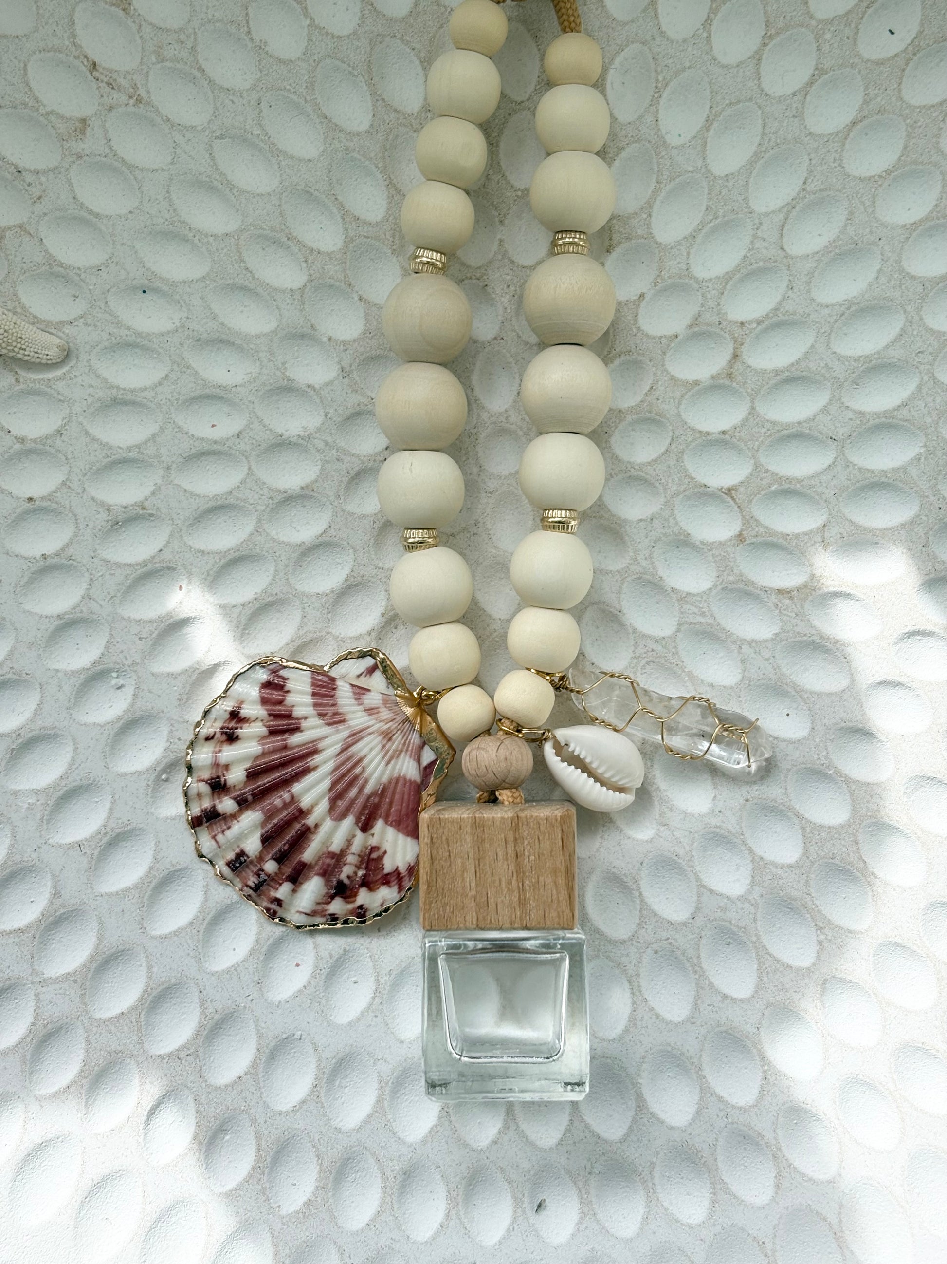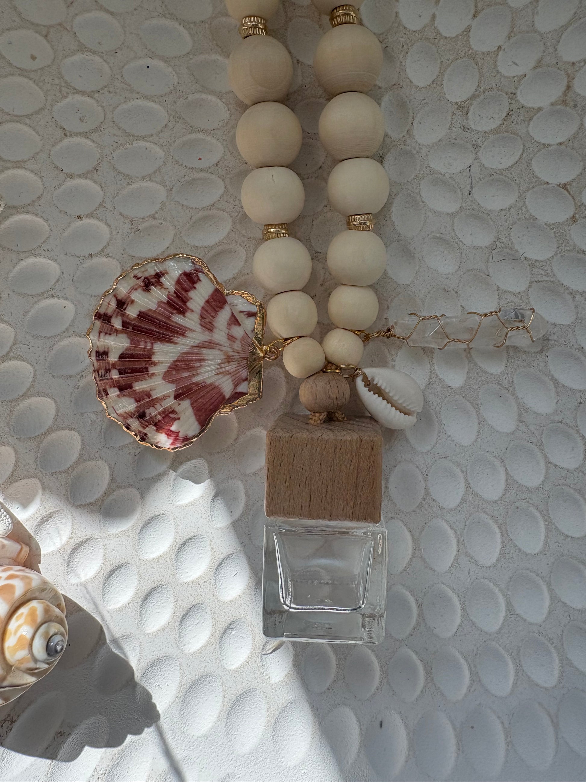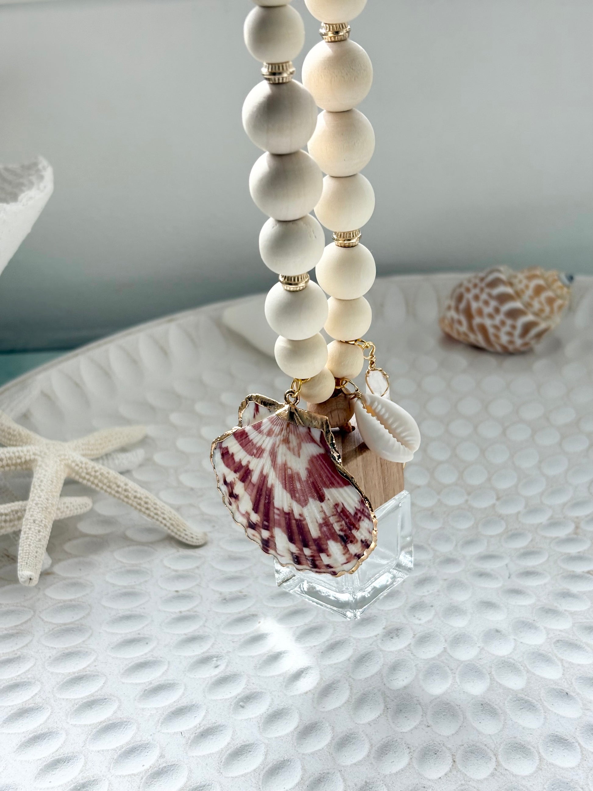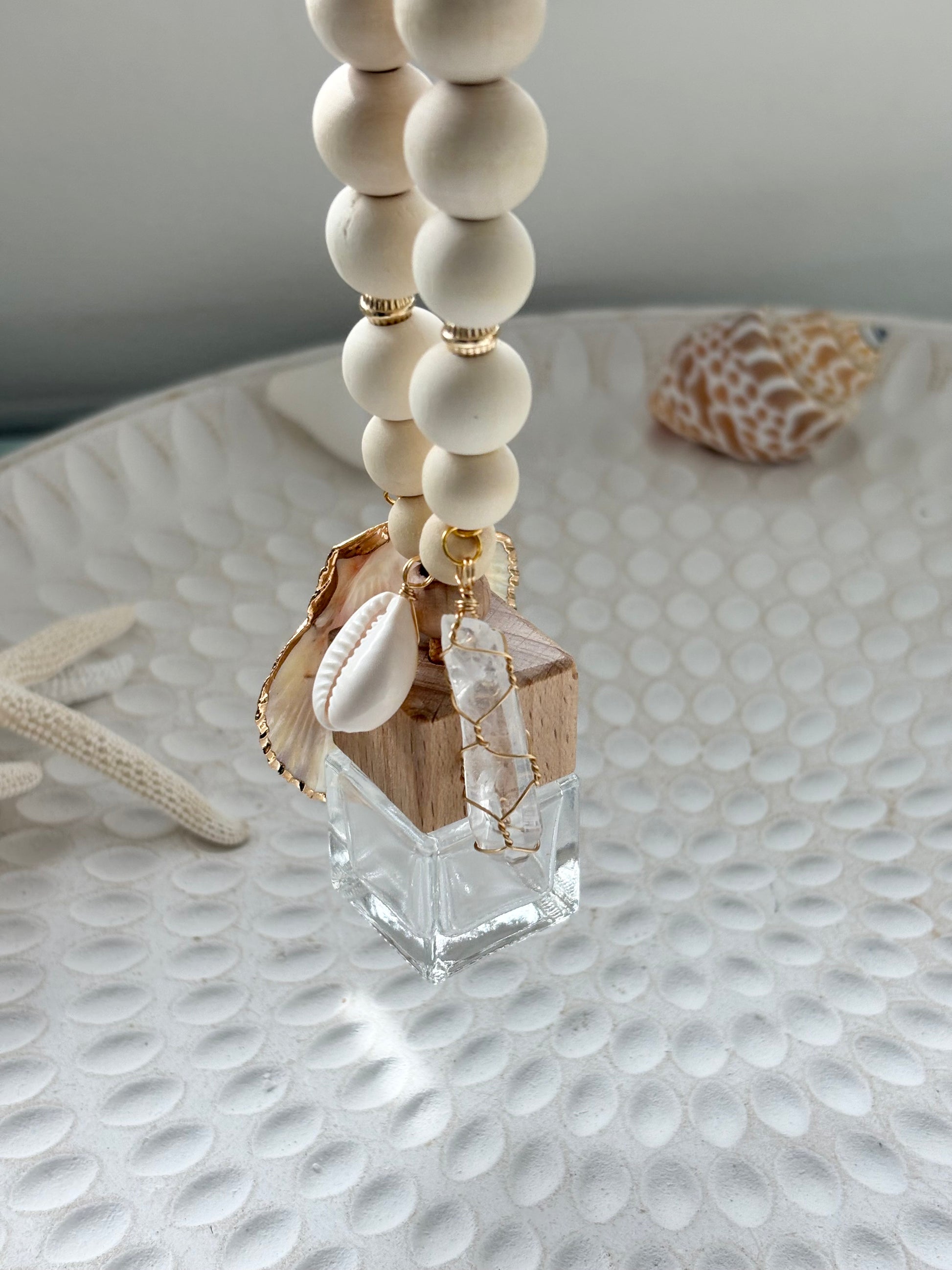 Bring the laid-back luxury of the coast to your daily drive with our Shellbound Car Diffuser. Hand-assembled with natural wooden beads, coastal shell accents, and a sleek glass diffuser bottle topped with raw timber, this piece is more than a car freshener, it’s a vibe.