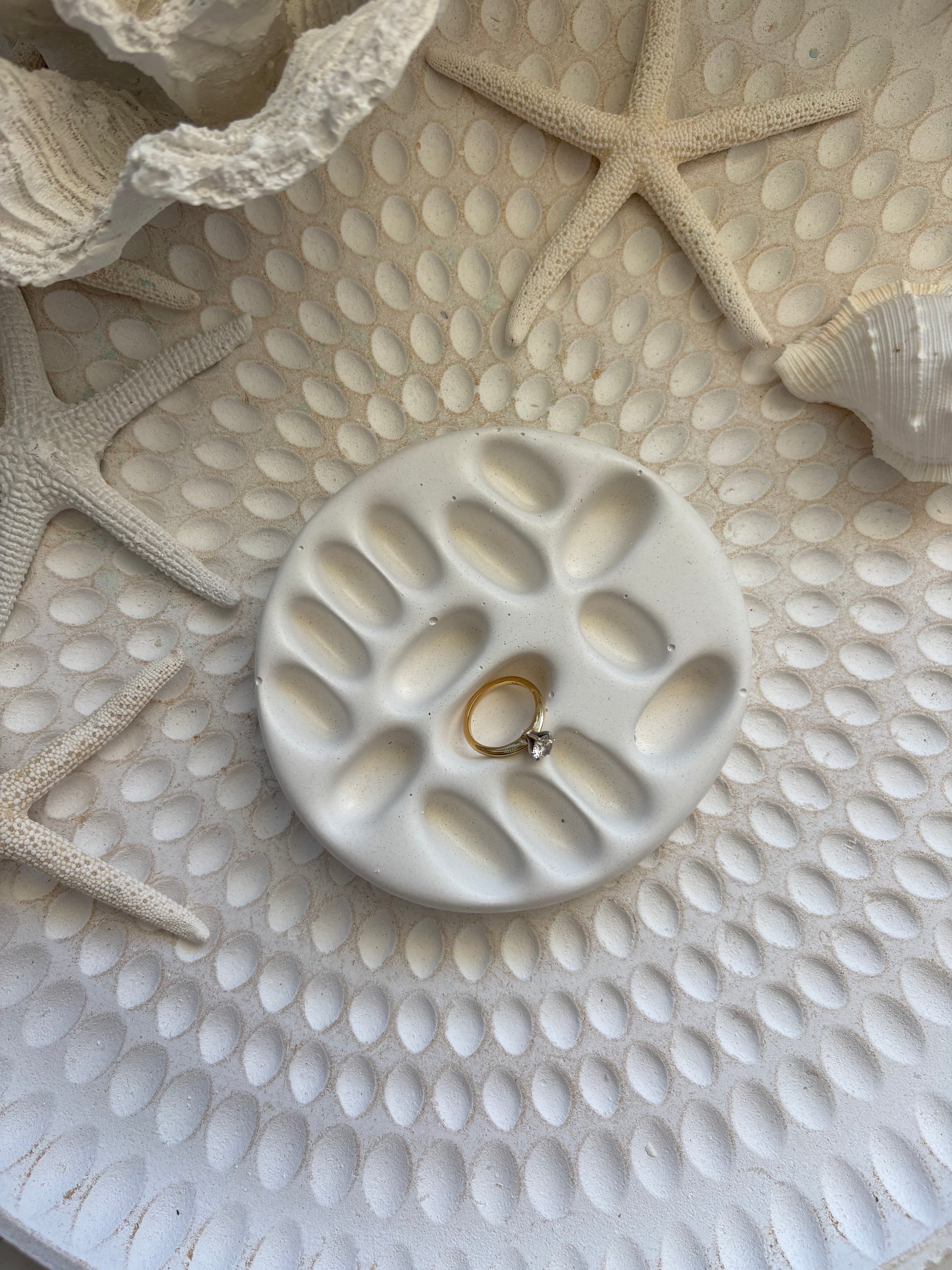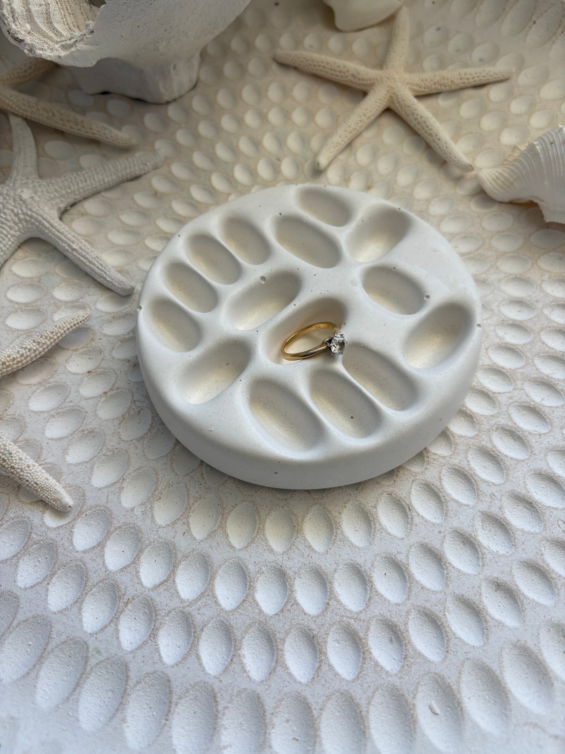This white textured ring tray features a soft, organic design with gently sculpted indentations, perfect for holding rings and small jewellery pieces. Its unique surface detail adds visual interest while maintaining a clean, coastal-inspired aesthetic that suits any space.